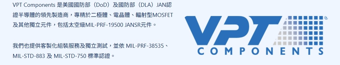 VPT Components的電晶體產品組合包括:NPN 與 PNP 小訊號雙載子元件;NPN 與 PNP 功率切換及四組切換(quad-switching)電晶體;矽控整流器 (SCR);經過認證的抗輻射 NPN 與 PNP 元件;MOSFET;以及 100V 至 250V 的 JANHC 與 JANKC 裸晶 (die)。
